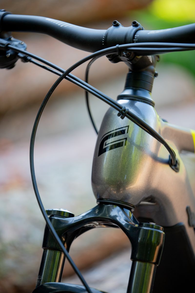 Model Crussis e-Largo 9.10 je horským elektrokolem s pevným rámem a koly o průměru 29. Na první pohled stroj vypadá solidně, moderně a bytelně, což volba většího průměru kol ještě podtrhuje. Jsou tím zajištěny dobré jízdní vlastnosti, stabilita a maximální trakce. Hliníkový rám s masivnější spodní trubkou má lehký sloping horní rámové trubky, která pak za sedlovou trubkou úhledně a plynule přechází v horní vzpěru zadního trojúhelníku a míří až ke koncovým patkám. Na nich, stejně jako na vidlici u předního kola, registrujeme, že osy kol nejsou pevné, ale na klasický rychloupínák. Fixace kol v rámu je i tak velice dobrá a tuhá a na funkci ani jízdní vlastnosti to při běžném rekreačně-sportovním použití nemá vliv, navíc ani v této cenové kategorii není pevná osa standardem. Zpětným pohledem na rám obdivujeme jeho zajímavý metalický lak kombinovaný se žlutými prvky. Ono té žluté není na rámu zase tak moc a v podstatě se jedná o esteticky povedené designové doplnění celku, které je veselé, má šmrnc a nepřehlédnutelný e-bike jeho majitel snadno identifikuje v zástupu ostatních elektrokol.