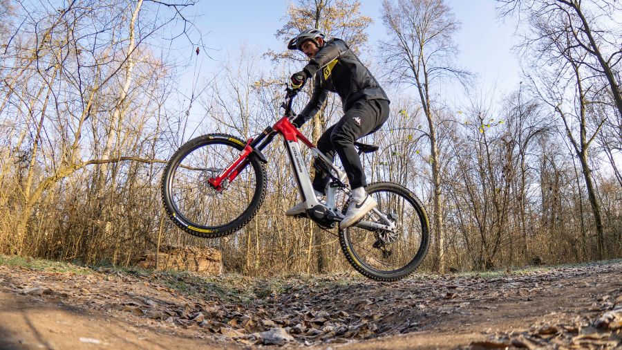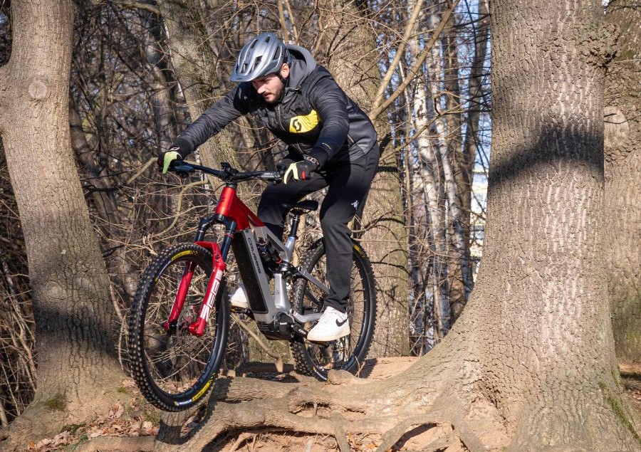 Pneumatiky Michelin E-Wild v rozměru 29 × 2,60 palce představují špičkovou volbu pro těžší traily. Agresivní dezén s výraznými bloky poskytuje výborný záběr na všech površích od suchého prachu přes kořeny až po bahno. Široká konstrukce 2,60“ zajišťuje maximální stabilitu, kontrolu a oporu v klopenkách i otevřených zatáčkách a průjezdech po nestabilním podkladu. Dvanáctirychlostní řazení SRAM Eagle pokrývá široké spektrum převodů pro různé jízdní podmínky a situace. Bezdrátové řazení probíhá rychle a přesně, přehazovačka spolehlivě vede řetěz mezi pastorky i při plném zatížení motoru. Teleskopická sedlovka umožňuje rychlé přesuny těžiště během jízdy a stejně tak ulehčí nasedání a sesedání z e-biku. Akumulátor LG s kapacitou 715 Wh a napětím 36 V poskytuje dostatečnou energii pro dlouhé výjezdy v náročném terénu. Výrobce uvádí maximální dojezd až 170 km, ten reálný se samozřejmě liší podle zvoleného režimu asistence, hmotnosti jezdce, charakteru terénu a stylu jízdy. V nejúspornějším režimu ECO a mírnějším profilu tratě můžete počítat s dojezdem kolem 120-140 km. V režimu STANDARD při kombinaci výjezdů a sjezdů pak 80-100 km. Při plném využití režimu HIGH na technických trailech s častými výjezdy se baterie vybije přibližně po 50-70 kilometrech. Díky modernímu barevnému displeji máme přehled o zbývající kapacitě, aktuální spotřebě a odhadovaném dojezdu. Automatický režim s umělou inteligencí dokáže sám vyhodnotit terén a styl jízdy a přizpůsobit asistenci motoru jízdě.