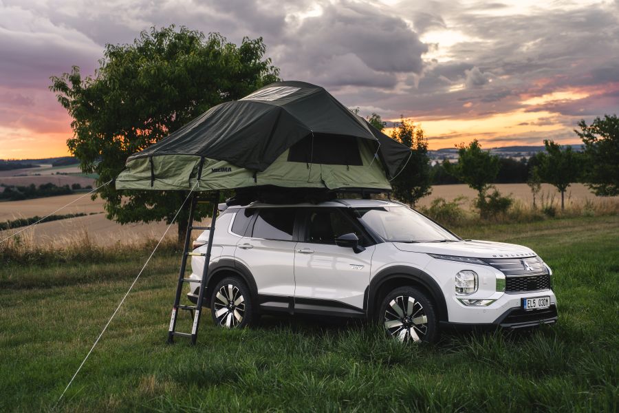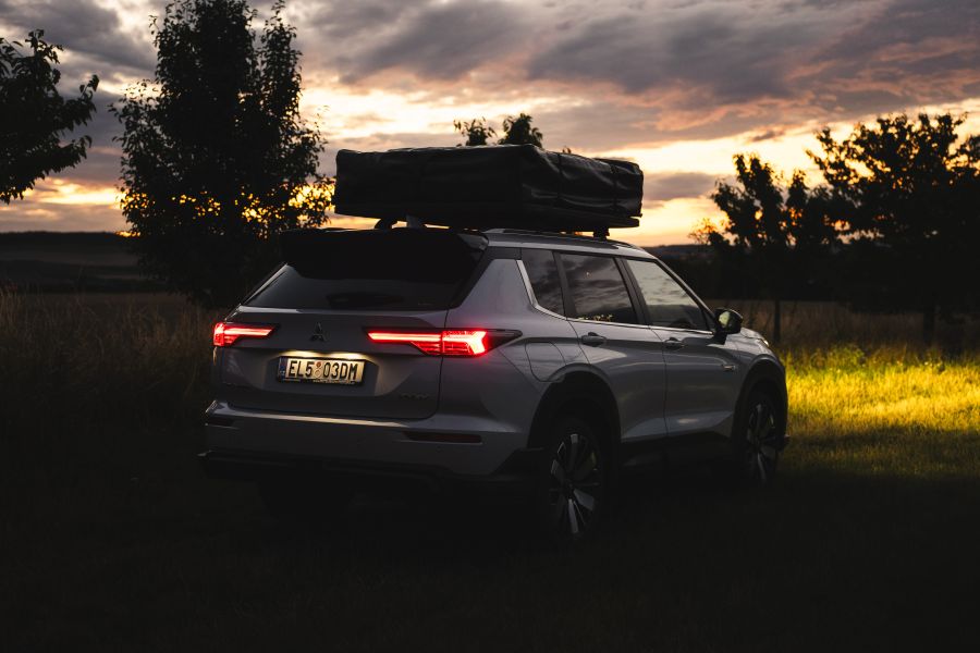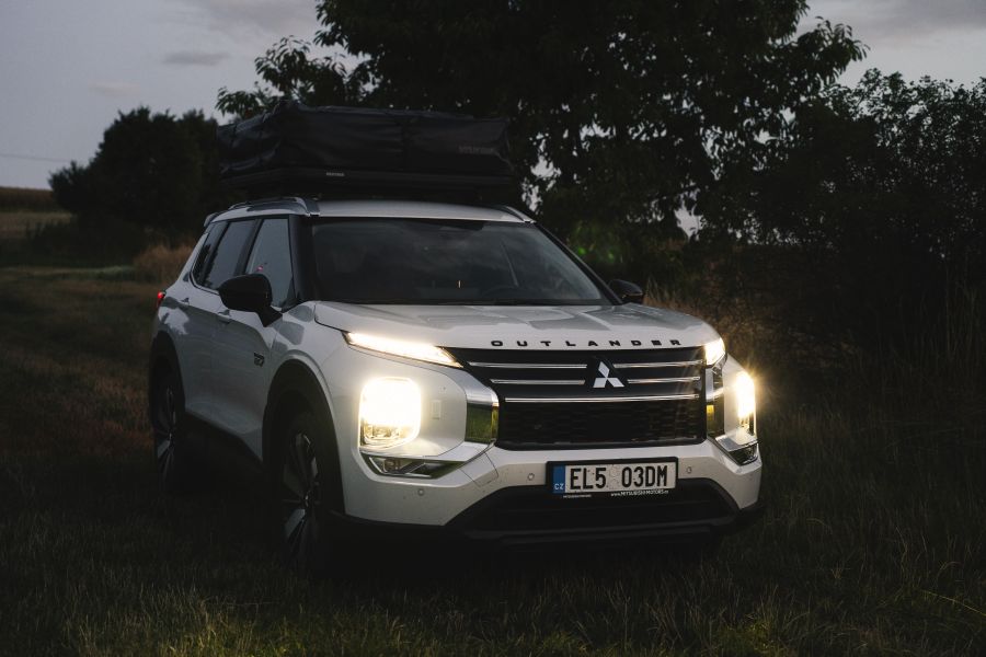 Konečně pořádné SUV, to si jistě pomysleli příznivci značky se třemi diamanty na kapotě, když poprvé spatřili na fotkách nové Mitsubishi Outlander. Než se ale tento svalnatý a moderními technologiemi nabitý Japonec dostal na náš, respektive evropský trh, tak to nějaký čas trvalo. Nyní je ale tady, vyhlíží luxusně, mohutně a velkolepě. Daleko více než předchozí generace tohoto modelu nám v hlavě naskakuje teréňák Mitsubishi Pajero. Právě na jeho nezaměnitelný čumák, světlomety a mohutnost jako by chtělo nové Mitsubishi Outlander PHEV navázat. Zkrátka a dobře je to nová a reprezentativní vlajková loď značky, na kterou se čekalo! V našem případě je vozidlo navíc ještě vyšperkováno střešním stanem. Tento doplněk nechal na novinářský Outlander namontovat přímo importér. Když se nás před testem ptali, zda potřebujeme auto bez stanu, anebo tato „zátěž“ nevadí, vyjádřili jsme se jasně – stan během testování určitě využijeme! A byla to pravda, dopřáli jsme si v něm tři outdoorové večery a přespání ve výšinách s romantickým večerem i fascinujícím východem slunce, které se do stanu dralo ráno. Kde jinde si připadat jako v divočině než na střeše téměř expedičního terénního SUV?