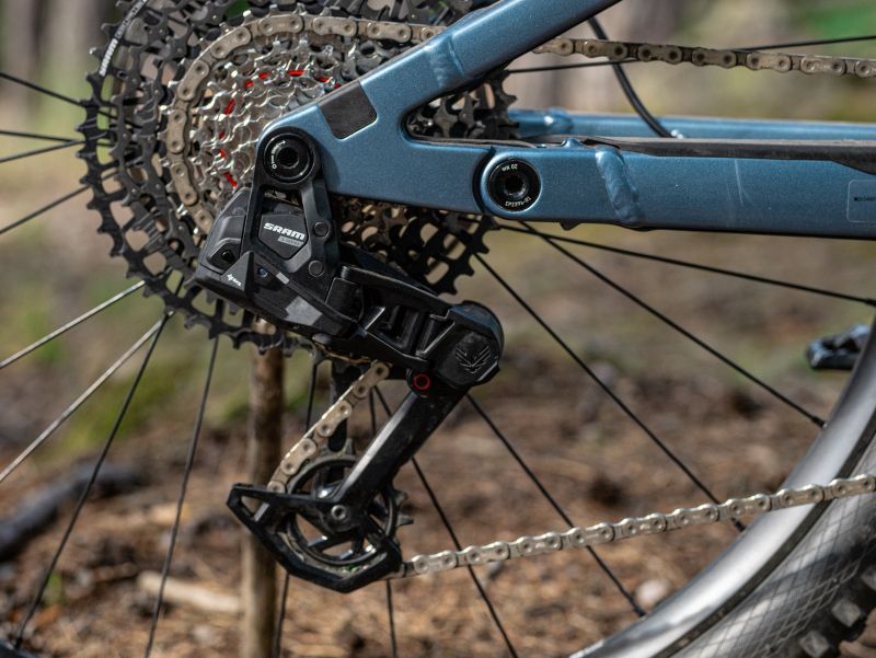 Testovaná nejvyšší specifikace je vybavena vidlicí RockShox Lyrik Base se zdvihem 150 mm a proporčně adekvátním tlumičem RockShox Deluxe Select, který pracuje se 145 mm zdvihu. Vidlici můžeme nastavit ve velkém rozsahu a upravit odskok i kompresi, takže jízda po nerovnostech bude skutečným balzámem. U tlumiče můžeme také nastavit odskok a vyladit si chod zadní stavby podle svého stylu. Zvědavi jsme byli na brzdy SRAM DB8 Stealth s 200milimetrovými kotouči. Mile nás překvapily, protože jejich chod byl skutečně nekompromisní a velmi blízký vrcholnému modelu Maven. Ostatně společné mají to, že místo brzdové kapaliny je v nich minerální olej, funkce je precizní a eliminuje se zavzdušnění. Třešinkou na našem dortu je bezdrátové řazení SRAM S-1000 Eagle AXS Transmission, které použití e-biku dává jinou úroveň z pohledu snadného, spolehlivého i přesného ovládání.