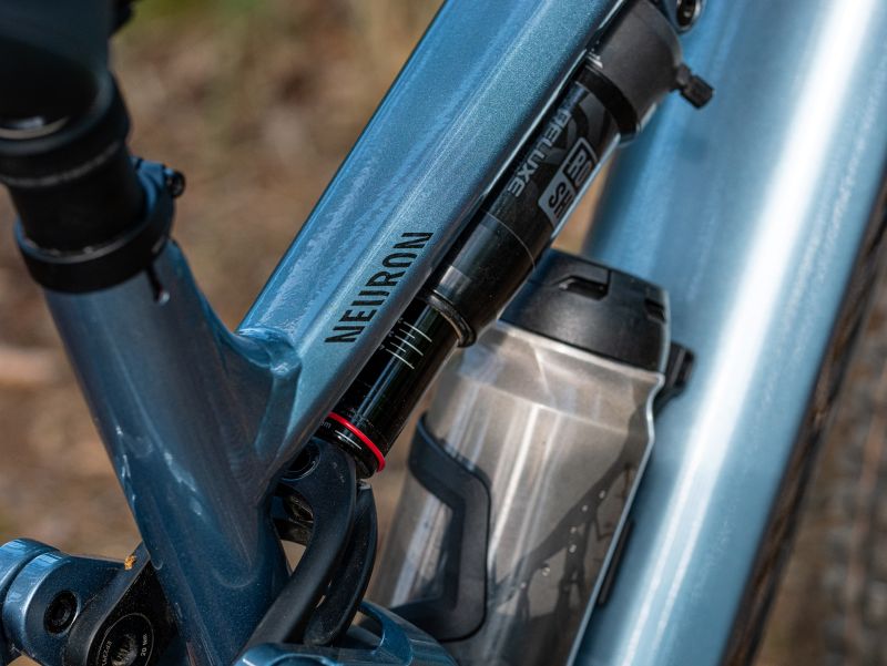 Pojmenování Neuron má v nabídce Canyonu své stálé místo a je to skutečně přiléhavé jméno pro terénní kolo bez motoru i s ním. Každé nasednutí a sevření řídítek kvalitně zpracovaného stroje je silným stimulem pro neurony, základní stavební buňky nervového systému jezdce. Značka tento e-full charakterizuje jako své nejuniverzálnější horské elektrokolo. Něco na tom bude. Zdvihy byly posíleny a nyní spoléháme na 150 mm u přední vidlice a 145 mm u tlumiče v zadní odpružené stavbě. S takovými zdvihy a perfektní kinematikou zadní stavby není problém zdolat i náročnější tratě. Samotný rám má moderní tvary a trailovou geometrii s vyváženou pozicí jezdce co nejblíž těžišti a v plné kontrole kokpitu a předního kola. Celkem subtilní silueta rámu je inspirována již loňským karbonovým modelem Neuron:ONfly a trubkám z hliníkové slitiny přidává na objemu pouze tam, kde je třeba. Nejvyšší verze Neuron:ON AL 9 se dodává buď v námi testované modré pojmenované „metalická oceánová modř“ anebo ve druhém odstínu s názvem „kosmická šedá“. Obě barvy jsou povedené a dávají vyniknout tvarům rámu.