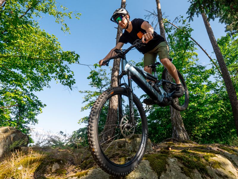 Sada kol DT Swiss H 1900 LS je obuta do plášťů Schwalbe, vpředu je to Magic Mary s pořádným vzorkem Super Trail a měkčí směsí, vzadu pak model Hans Dampf s o něco tvrdší směsí Speedgrip Runner. Tohle kombo se postará o vynikající přilnavost a jistou trakci i na technických trailech. Canyon použil vlastní, moderně designované komponenty, a to jak u kokpitu, tak u teleskopické sedlovky. Vše funguje a na prvním místě je skvělý pocit jezdce a stoprocentní kontrola a snadné ovládání stroje.